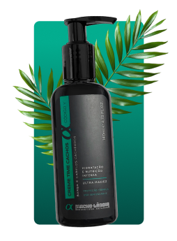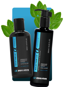 O bálsamo complementa com Tolú, Cevada, Coco e Lama Vulcânica, selando cutículas, hidratando e protegendo.